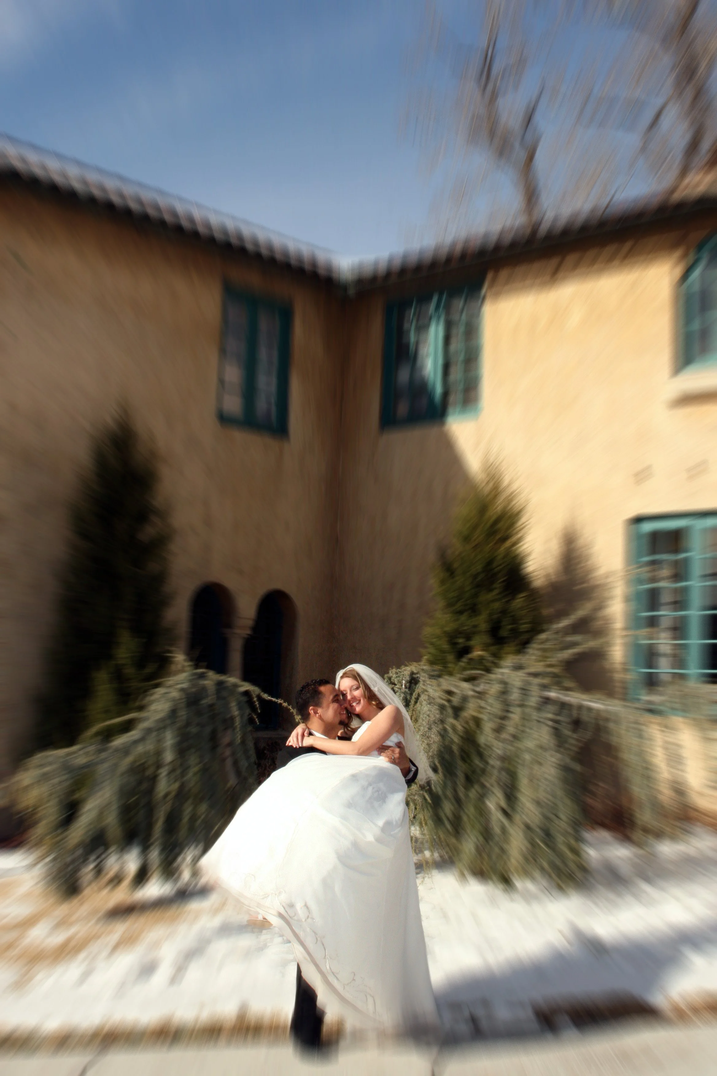 Rich holding Kristi in his arms over the snow on their wedding day.